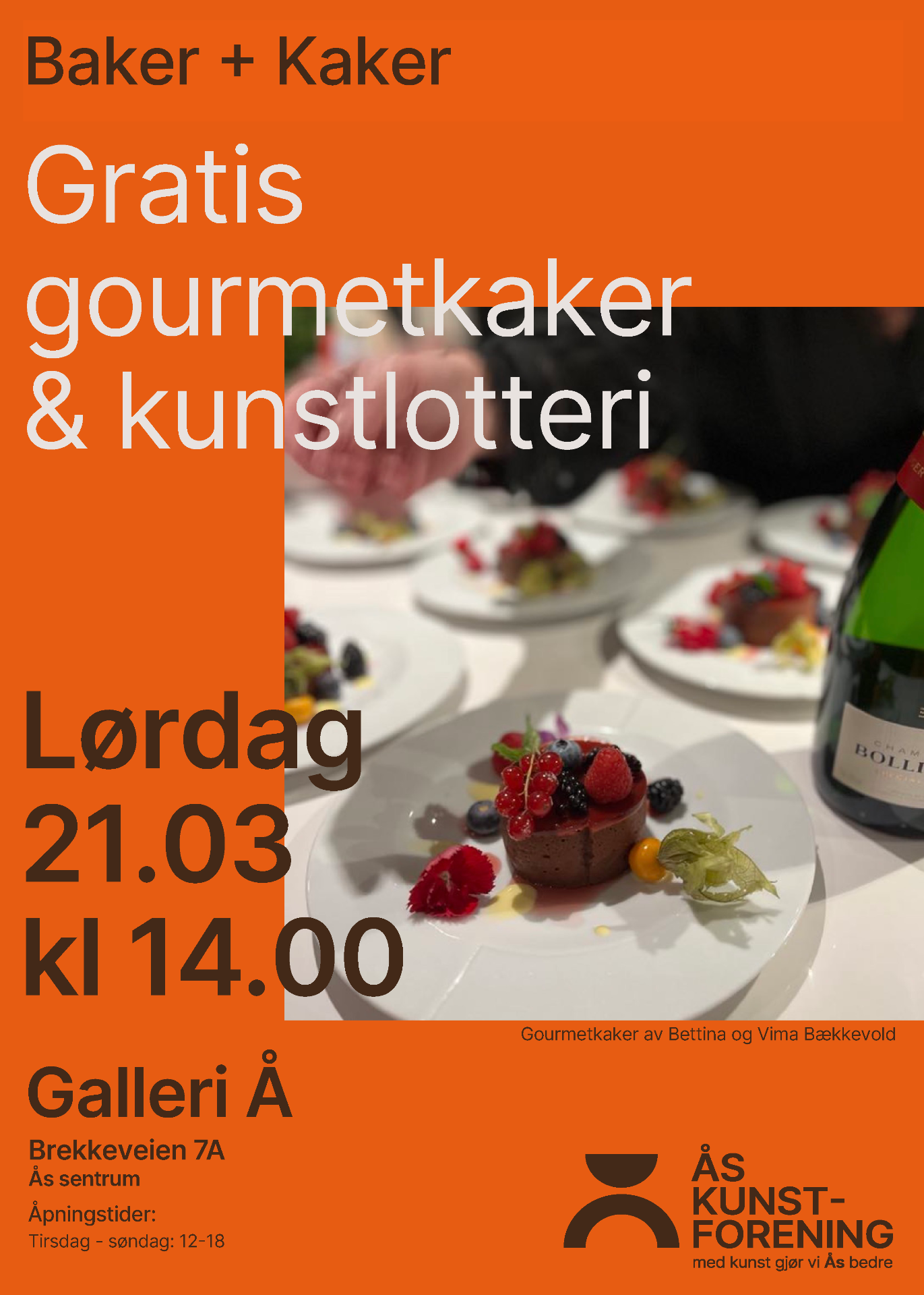 Velkommen til en kulinarisk ettermiddag med gratis gourmetkaker og kunstlotteri. Lørdag 21. mars Kl. 14 serverer Ås kunstforening gourmetkaker, håndlaget av Bettina Bækkevold. Samtidig kan du bli med på en kunstlotteri med bilder fra foreningens kunstsamling.